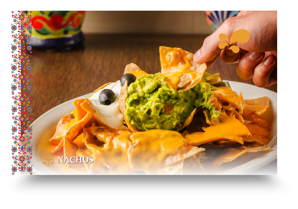 Nachos with cheese, guacamole, cream, jalapeño, & salsa.